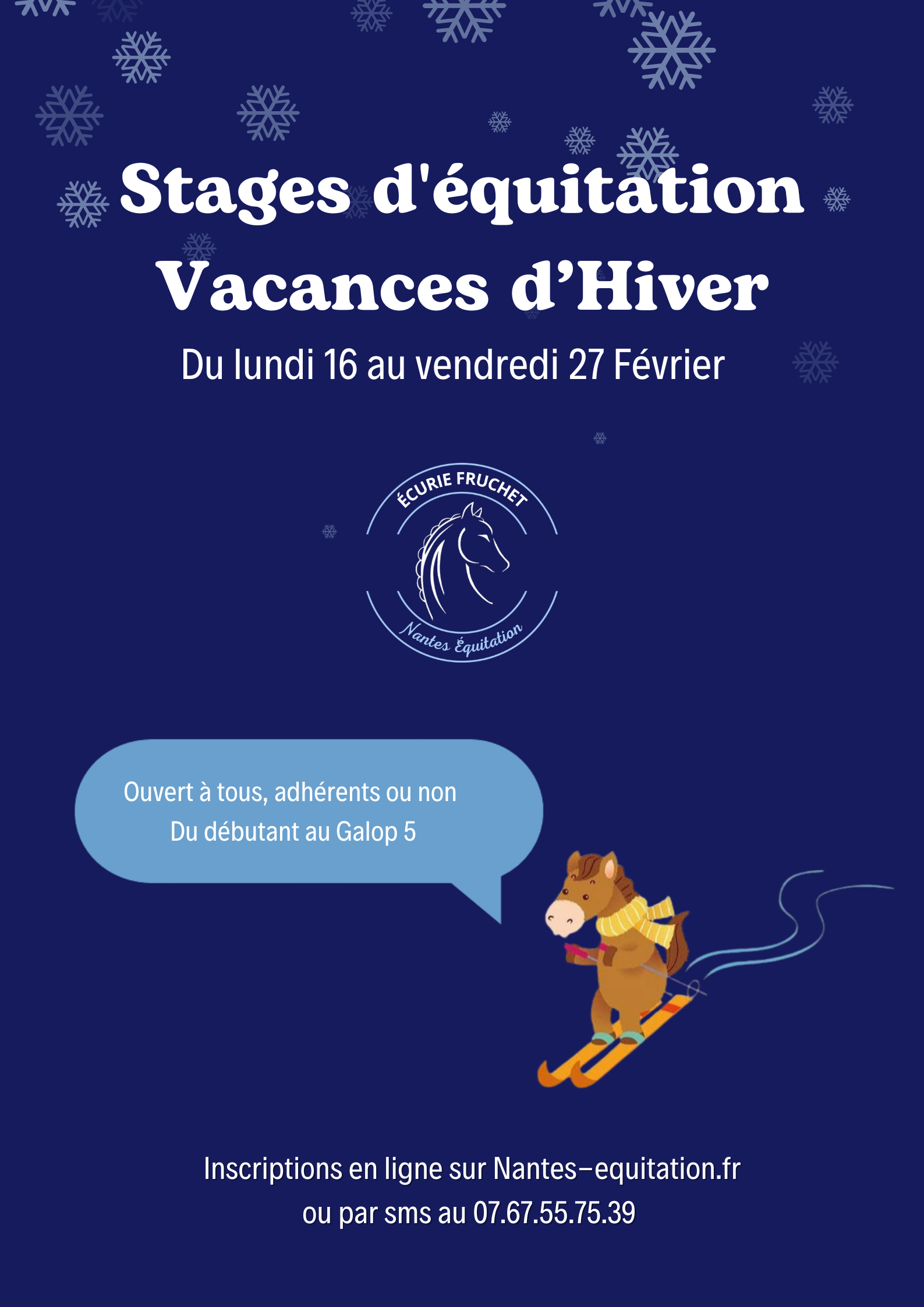 Les Écuries Fruchet – Nantes Équitation proposent des stages à la semaine pendant les vacances scolaires, ouverts à tous, adhérents ou non.